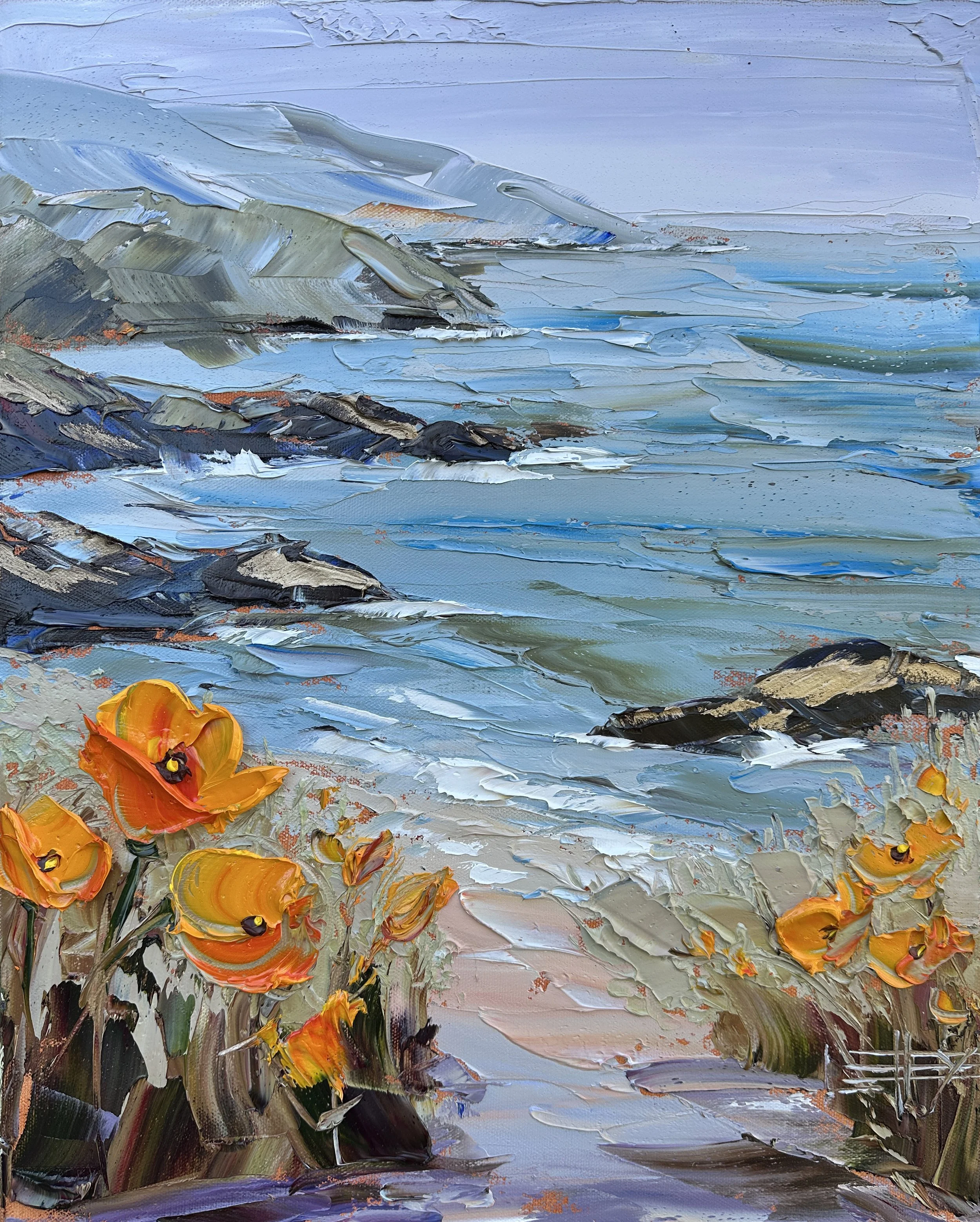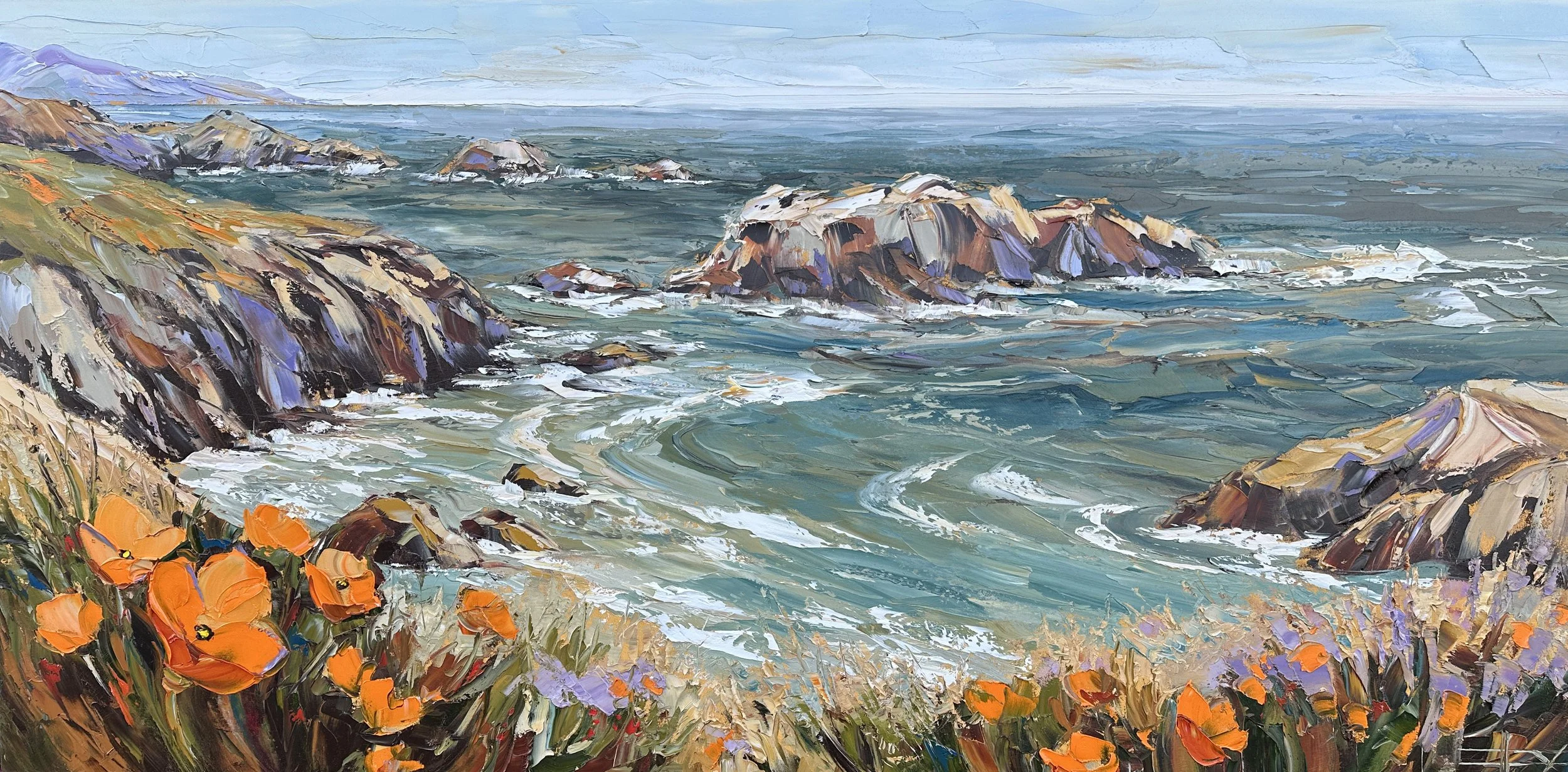 This original coastal oil painting is a large-scale diptych inspired by the California coastline, where open ocean meets windswept cliffs and wild poppies. Painted with a palette knife, the piece moves between calm horizon and vibrant foreground, bringing both stillness and energy into the space.