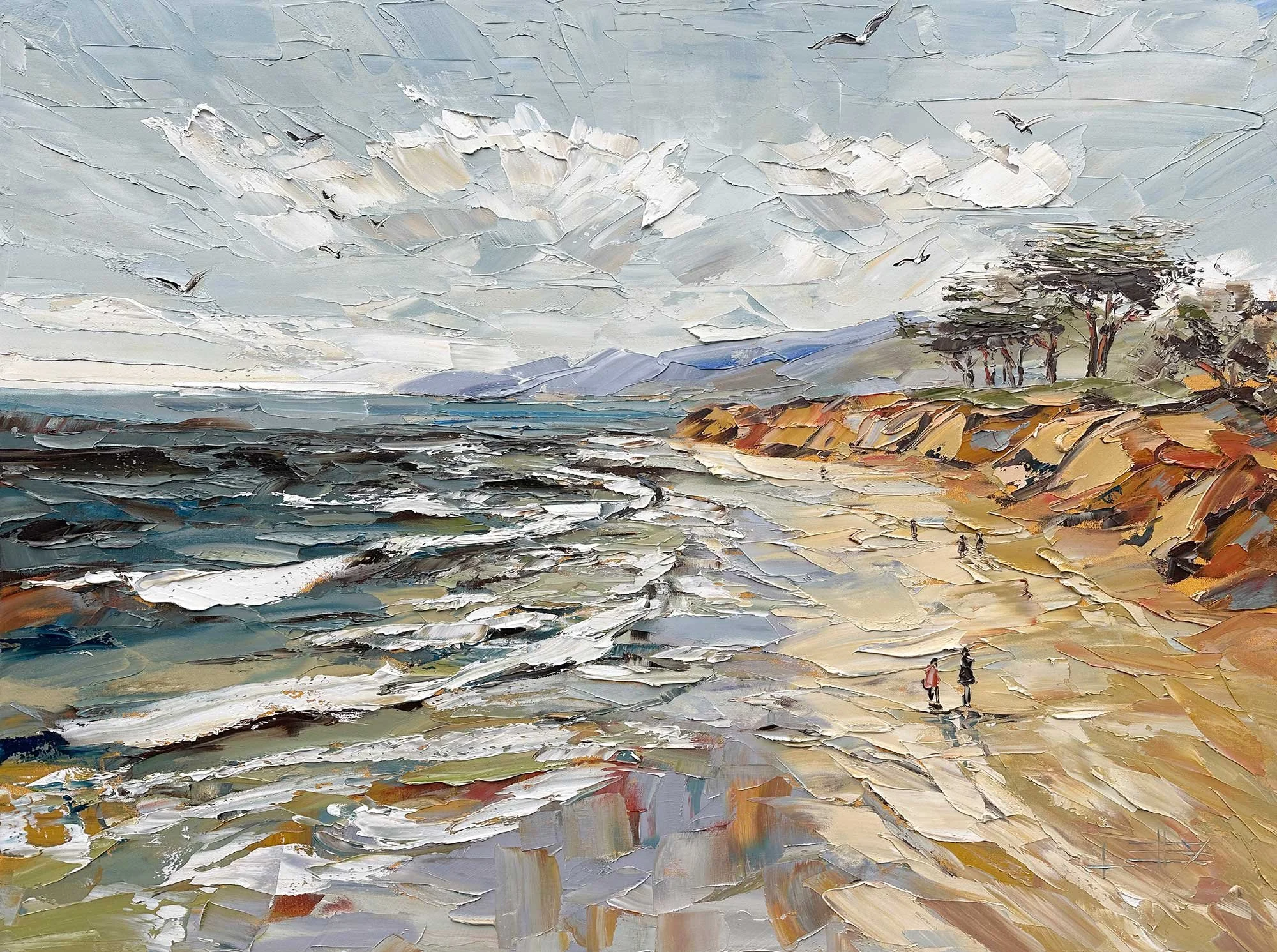 Bring the beauty of the California coast home with Beach Walk, an original oil painting inspired by a peaceful shoreline stroll beneath wide open skies. Created with expressive palette knife texture, this large 48 x 36 inch statement piece captures rolling surf, warm coastal bluffs, distant blue headlands, and the quiet rhythm of the sea.