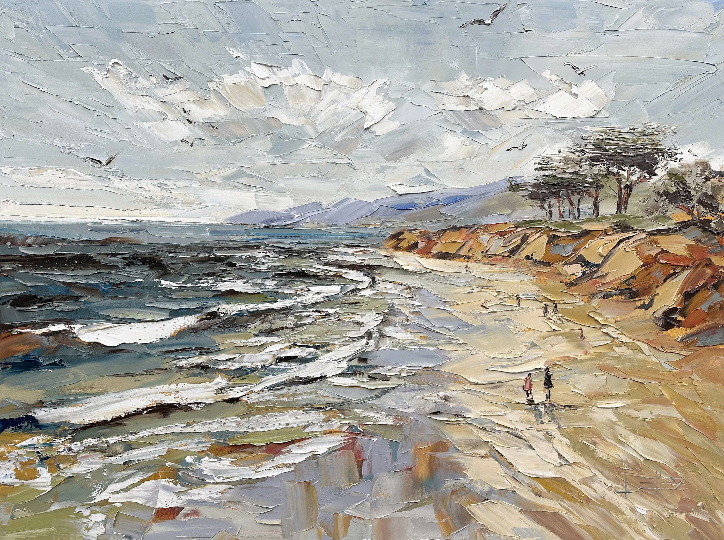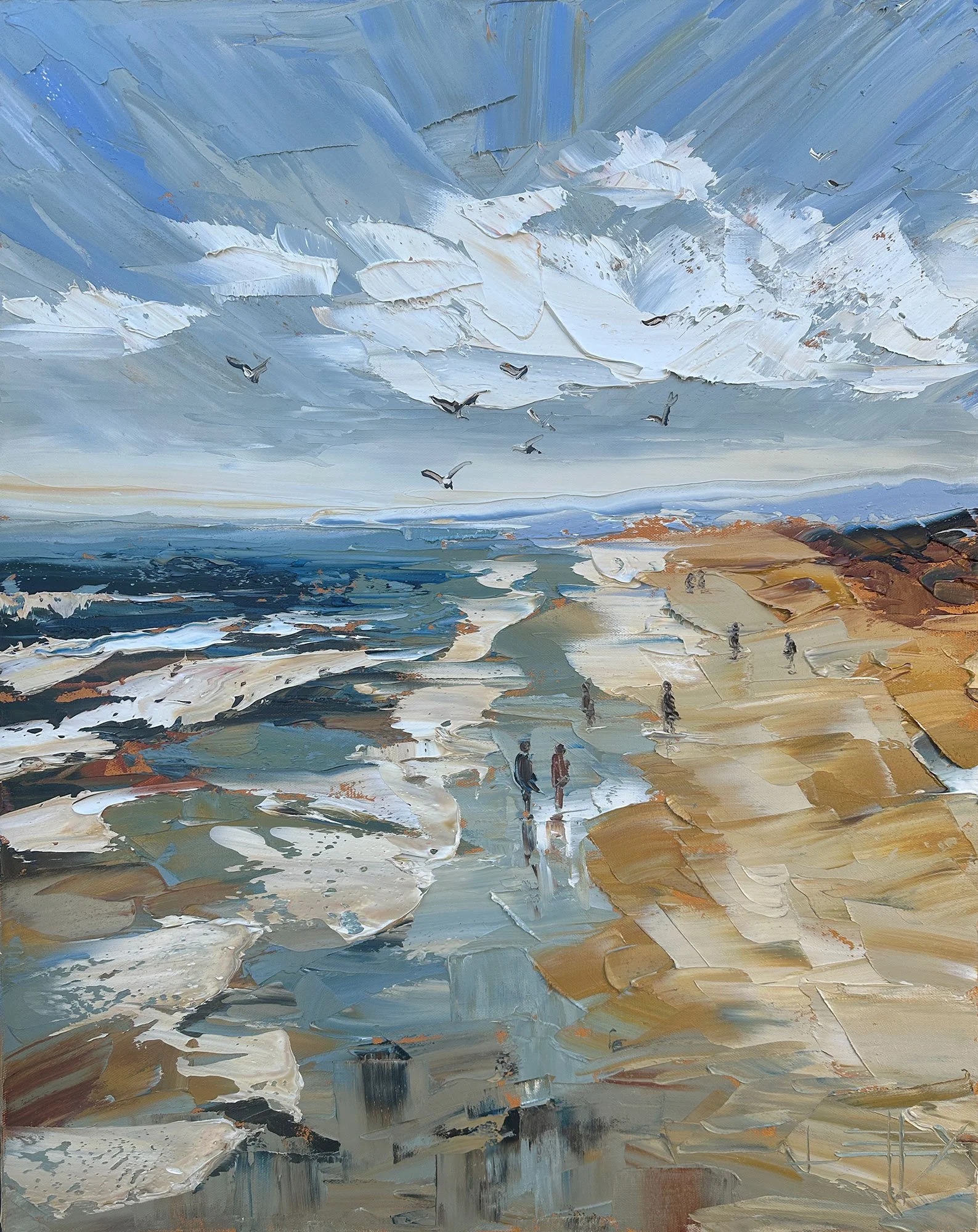 This original coastal oil painting captures a quiet stretch of shoreline where the land curves gently into the sea. Painted with a palette knife, Tidal Light explores movement and stillness, with the rhythm of waves folding onto sand, and the soft tonal shifts of sky, water, and coastal cliffs.